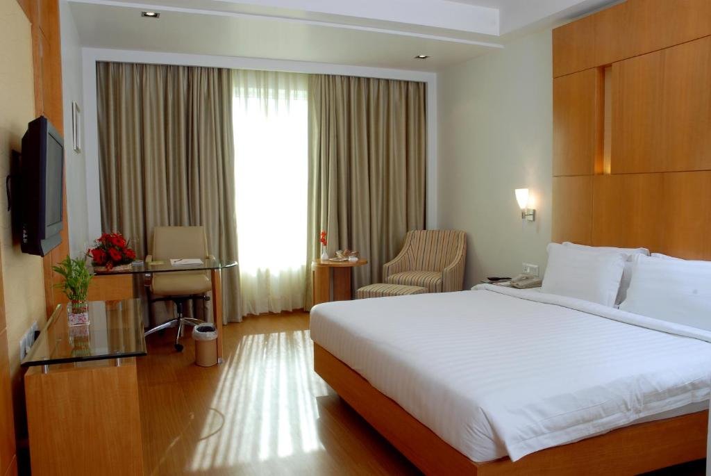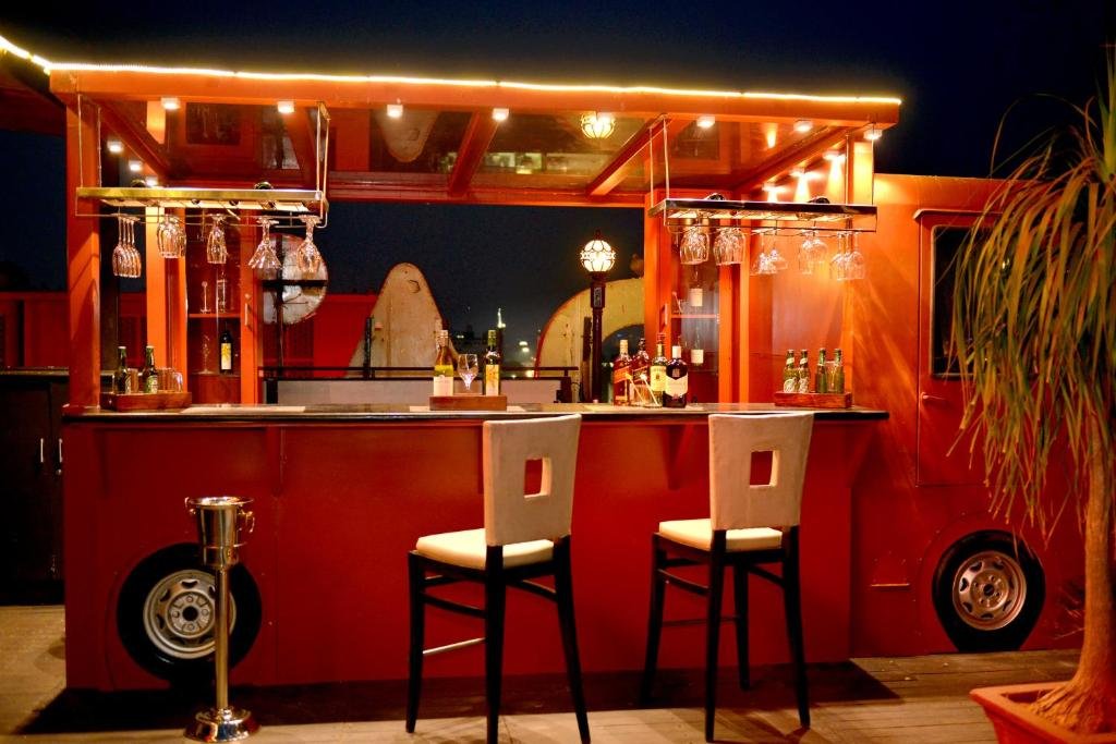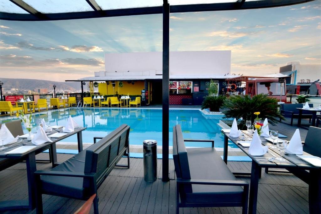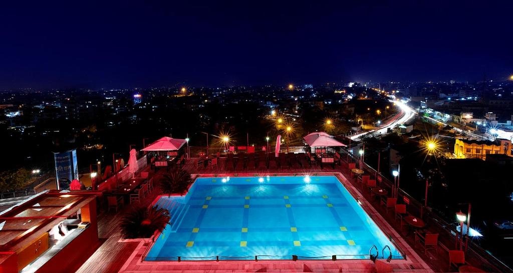 Ramada By Wyndham Jaipur is located in city centre, just 10 minutes\\\' drive from Jaipur Airport. Offering 24-hour room service, it also has a rooftop outdoor pool, a gym and a spa. Modern rooms are fitted with air conditioning and wooden flooring. A 40 inches LED TV, minibar and tea/coffee making facilities are standard features in rooms. En suite bathrooms have hot-water showers. Ramada By Wyndham Jaipur is a 15-minute drive from Jaipur Railway Station and Bus Terminal. Free on-site parking is available either underground or outdoors. Day trips and airport shuttles can be arranged at the tour desk. For guests\\\' convenience, the hotel also has a business centre and dry cleaning services. Around the World restaurant serves international cuisine, while Hi-LiFE THE ROOF TOP GRILL offers barbecue and grilled dishes.